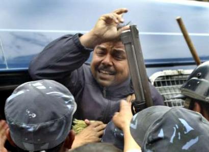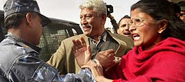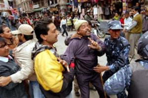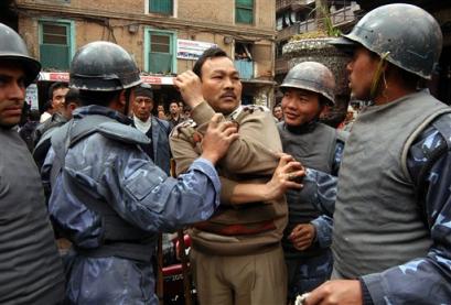 Nepalese policemen arrest a Nepali Congress activist as others raise anti-monarchy slogans in Katmandu, Nepal, Friday, Feb. 18, 2005.The Royal government plunged Nepal into a communication blackout Friday on Democracy Day, cutting phone service to thwart opposition activists trying to organize nationwide protest against the King's seizure of power earlier this month. (AP Photo/Gurinder Osan)