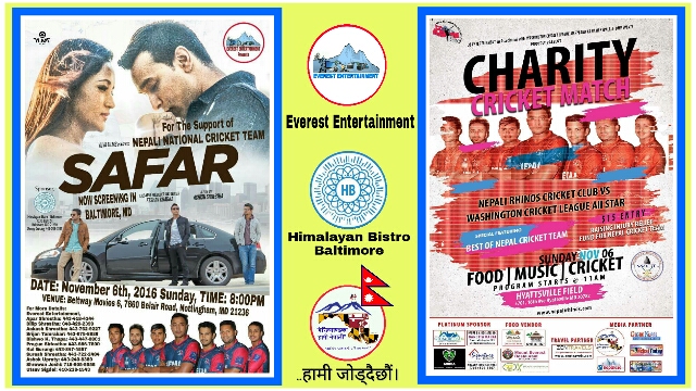 November 6, मा हुने यो मैत्रीपुर्ण खेल पछि सम्पुर्ण नेपाली राष्ट्रिय क्रिकेट टिमका सदस्यहरुलाई स्थानीय एभरेष्ट इन्टरटेन्ट्मेन्टका साथीहरूले सोही दिन बाल्टिमोरमा प्रदर्शन हुने नेपाली कथानक चलचित्र "सफर - SAFAR" देखाउन बाल्टिमोर ल्याउने भएका छन्। एभरेष्ट इन्टरटेन्ट्मेन्टका दिलिप श्रेष्ठ अनि अपार श्रेष्ठ लगायतका टिमका साथीहरू अहिले यसको प्रचारप्रसार तथा ब्यबस्थापनका लागि जोडतोड्ले लागिपरेका छन्। उहाँहरुका भनाई अनुसार यस चलचित्रबाट उठेको रकम पनि नेपाली राष्ट्रिय क्रिकेट टिमको सहयोगका लागि नै दिईने जानकारी दिएका छन्। प्रत्यक्ष रुपमा आफ्ना प्रिय राष्ट्रिय क्रिकेट टिमका कप्तान पारस खड्का लगायत सहितको खेलाडीहरुसंगै बसेर चलचित्र हेर्ने यो सुवर्ण अवसरमा हामी कोहि नछुटौं..आउनुहोस् नेपाली राष्ट्रिय क्रिकेट टिमलाई बाल्तिमोर मेरिल्याण्डमा भब्य स्वागत गरौं। "..यो एउटा ऐतिहासिक दिन हुनेछ बाल्टिमोरमा.."सफर" चलचित्रका निर्माता तथा लेखक श्री केशव खड्का ज्यु पनि यहि कार्यक्रममा आफ्नो पनि उपस्थिति जनाउदै टेक्सासबाट बाल्टिमोरवासीहरु र नेपाली खेलाडीहरुसंग भेटघाट गर्न आउने पनि पक्का भएको छ, आयोजक अपार श्रेष्ठ यहि बताउँछन्।