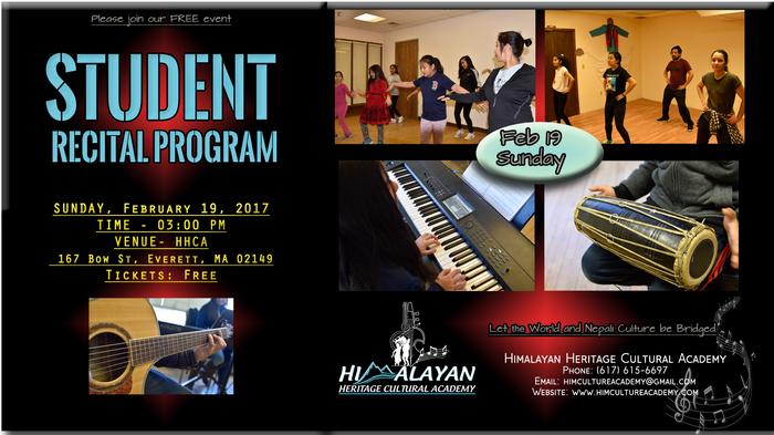 Student Recital Program of Himalayan Heritage Cultural Academy. Admission is FREE. PLEASE ATTEND THE SHOW and bring your friends and families and ENCOURAGE the students. Himalayan heritage cultural academy167 Bow St, Everett, MA 02149 ​Phone: ((617) 615-6697 himcultureacademy@gmail.com